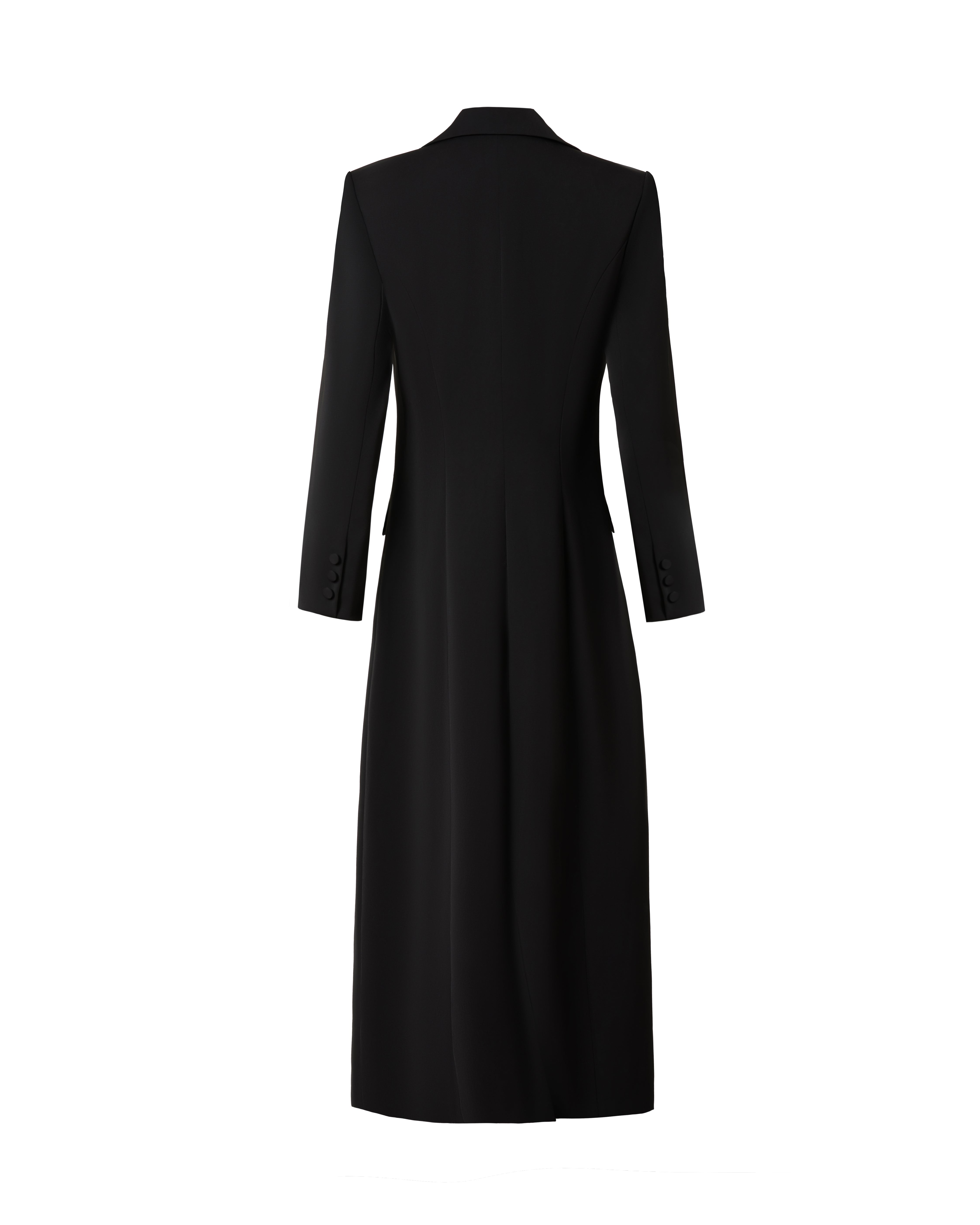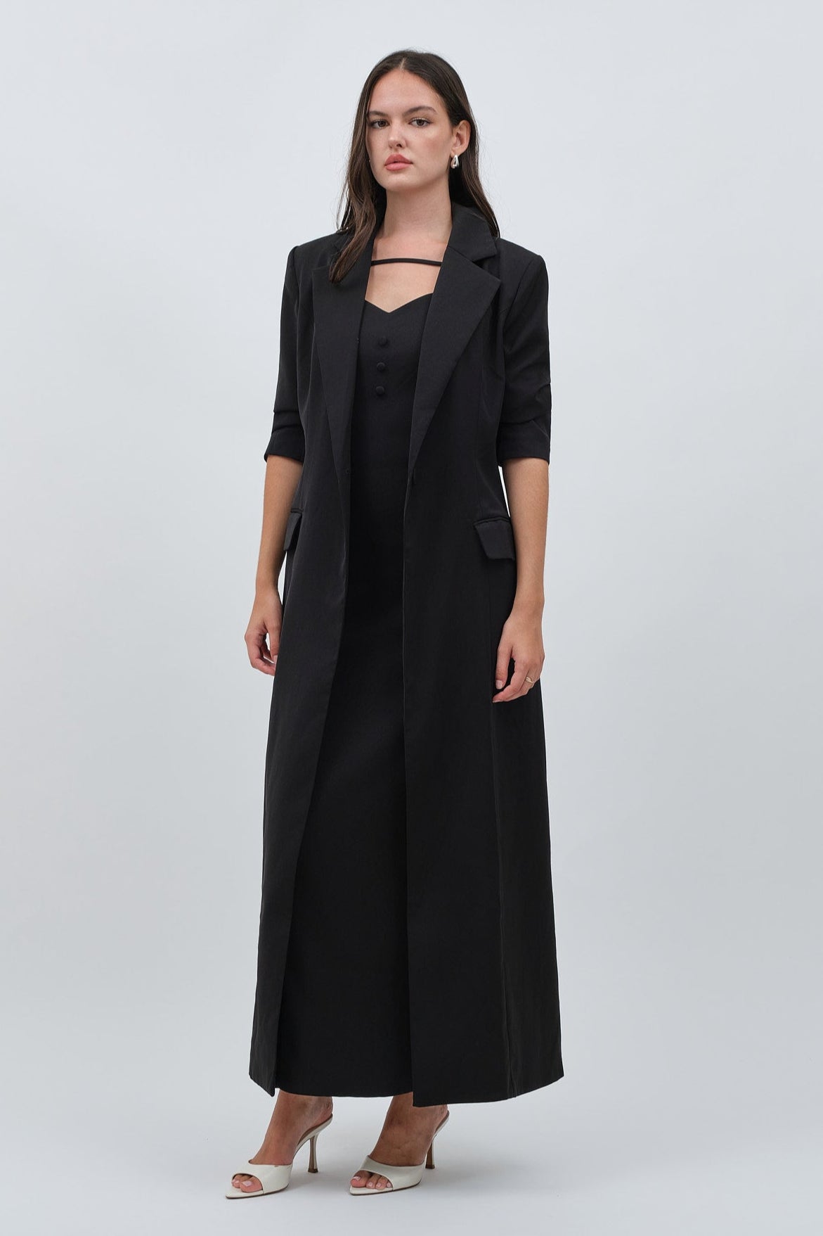 Our long blazer is tailored with a sleek silhouette that cinches at the waist, creating a flattering fit while maintaining effortless sophistication. Designed to be a versatile staple, it pairs seamlessly with any item from the collection—whether layered over a dress, styled with trousers, or matched with a skirt—for a look that transitions with ease from day to night.